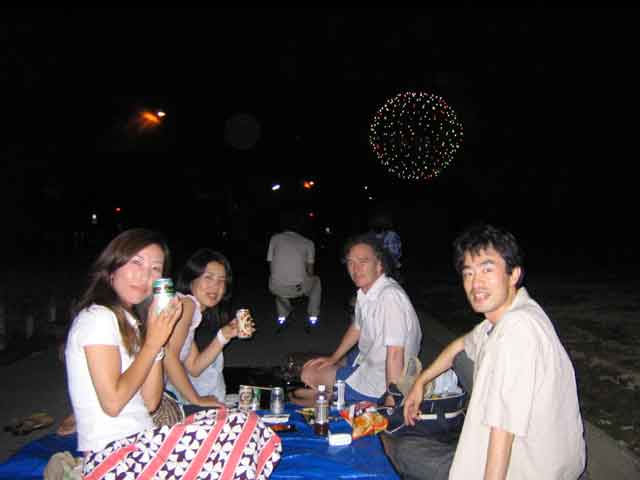 近くへは行けないだろうと、会場近くの道路にシートを敷き、そこで花火を楽しみました。