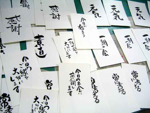 これを名刺にしたら面白いと思い、いろいろサンプルを作ってみました。自分の名刺用には「常に考える」と「素直」を書いてもらいました。安易だなあ~。