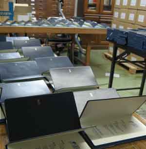 昭和テイスト満載の印刷機で今日も“カランコロン”と侘びしい音を立てて手帳に名入れ印刷がされていきます。社長が30代の頃、兄弟で印刷業を始めた頃から、これだけは自らで動かして印刷してきたようです。この印刷機は社長の印刷人生の象徴というか、いわゆる“大きな古時計”状態とでも言いましょうか。しかし、最近龍巳堂的事業承継を考えてますが、どうもこれは承継しづらいな(笑)。