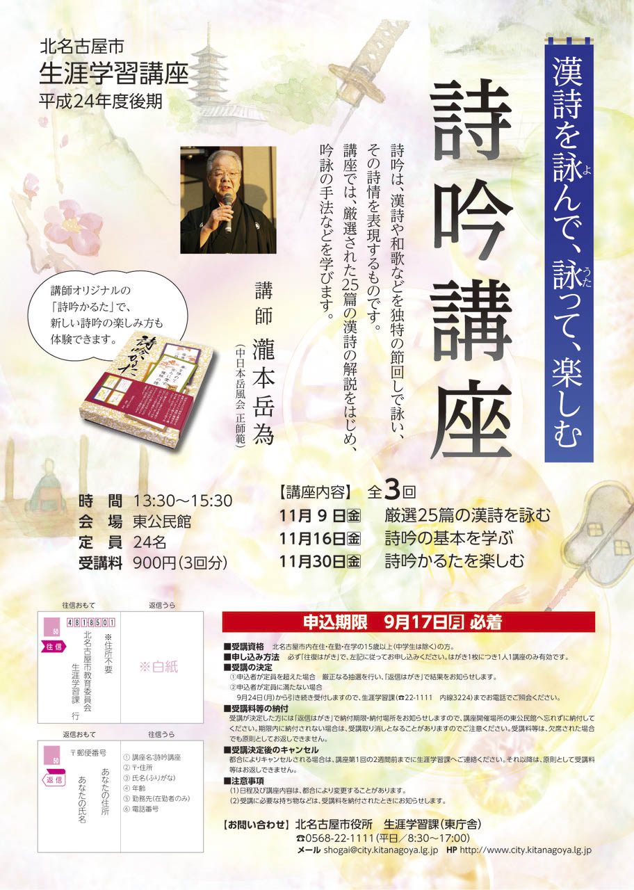 うちの父が、北名古屋市の生涯学習講座で、詩吟講座を開くことになりました。
